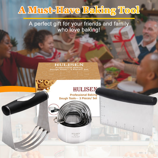 HULISEN Stainless Steel Baking Tool Set - Pastry Scraper & Dough Blender & Flour Duster & 5-Piece Biscuit Cutter