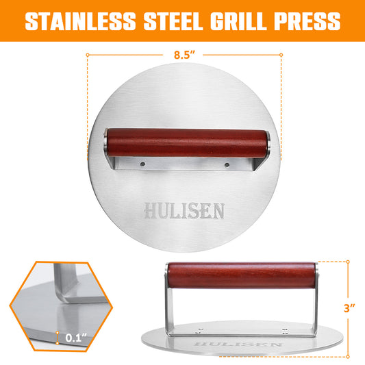 HULISEN 8.5-Inch Burger Press - 2.6 lb Heavy Duty Stainless Steel Bacon & Grill Press with Wood Handle